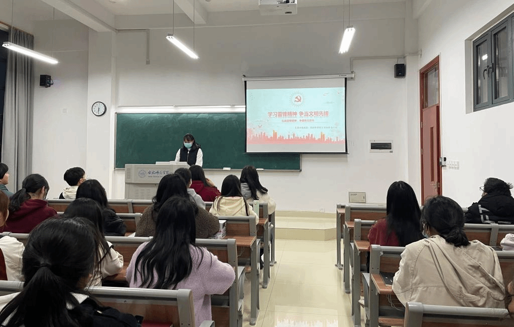 班会上,各班团支书首先点明“什么是雷锋精神”,如何讲好“雷锋故事”,然后以身边的实际案例表明“当代雷锋精神”的体现,最后表明学习“雷锋精神”的重要性。辅导员老师强调雷锋精神是中华民族精神一个重要的文化符号,学习传承雷锋精神有着永不过时的时代意义,学雷锋应该立足培育社会主义核心价值观的实践活动,把雷锋精神融入学习生活当中,为实现中华民族伟大复兴的中国梦而努力。