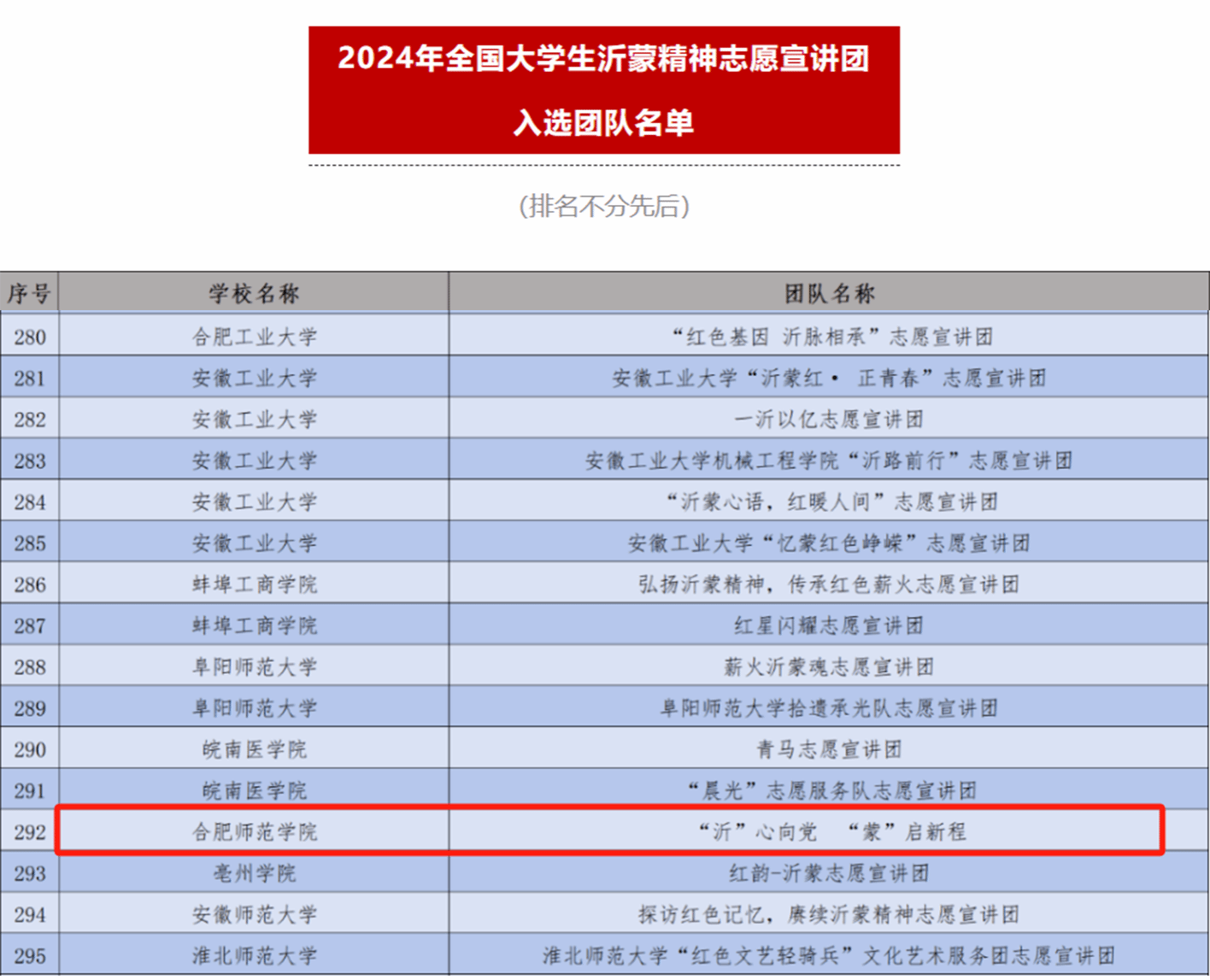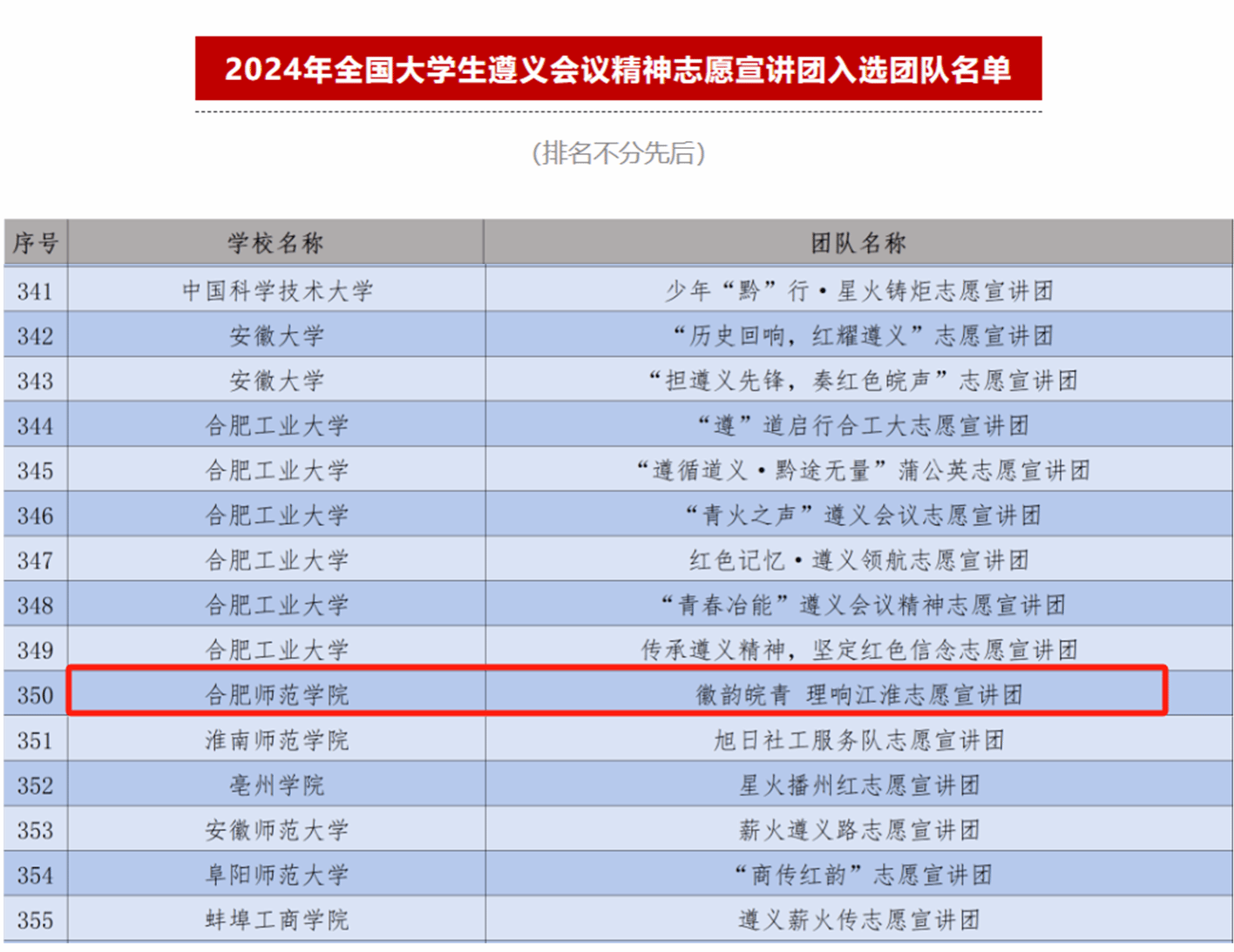 日前,团中央青年志愿者行动指导中心、中共遵义市委、共青团贵州省委共同发布了《关于遴选2024年全国大学生遵义会议精神志愿宣讲团的公告》,团中央青年志愿者行动指导中心、共青团山东省委、中共临沂市委共同发布了《关于遴选2024年全国大学生沂蒙精神志愿宣讲团的公告》。经过激烈的竞争与选拔,其中安徽省共有31支团队入选,365英国上市公司官网2支团队入选,分别是“徽韵皖青 理响江淮”宣讲团(遵义会议精神宣讲团)和“沂”心向党 ‘蒙’启新程”宣讲团(沂蒙精神宣讲团)。两支团队均由365英国上市公司官网2024级网络与新媒体(专升本)1班团支部书记张六军发起,王明蕾老师指导。