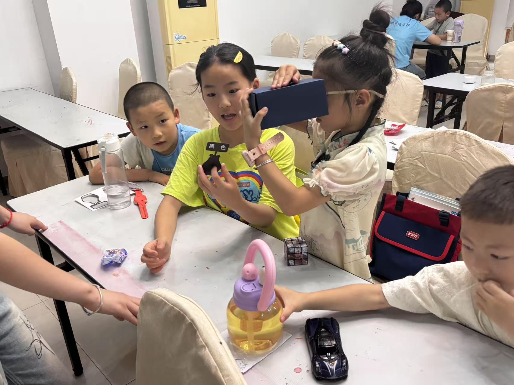 为了让学员们深入理解“可见性”背后的科学原理,学堂依托“七彩假期”公益项目提供的材料包,设计了极具参与感的“暗箱实验”。小学员们被分为4个小组,在“小先生”们的指导下动手组装实验箱——这个模拟夜间低光环境的装置,将成为检验“可见性”的关键道具。当孩子们依次将红、黄、蓝、黑等不同颜色的卡纸放入暗箱,原本认为“很醒目”的红色在模拟司机注意力分散的情境下,竟多次出现“视而不见”的情况,这一发现让不少孩子露出了惊讶的表情。