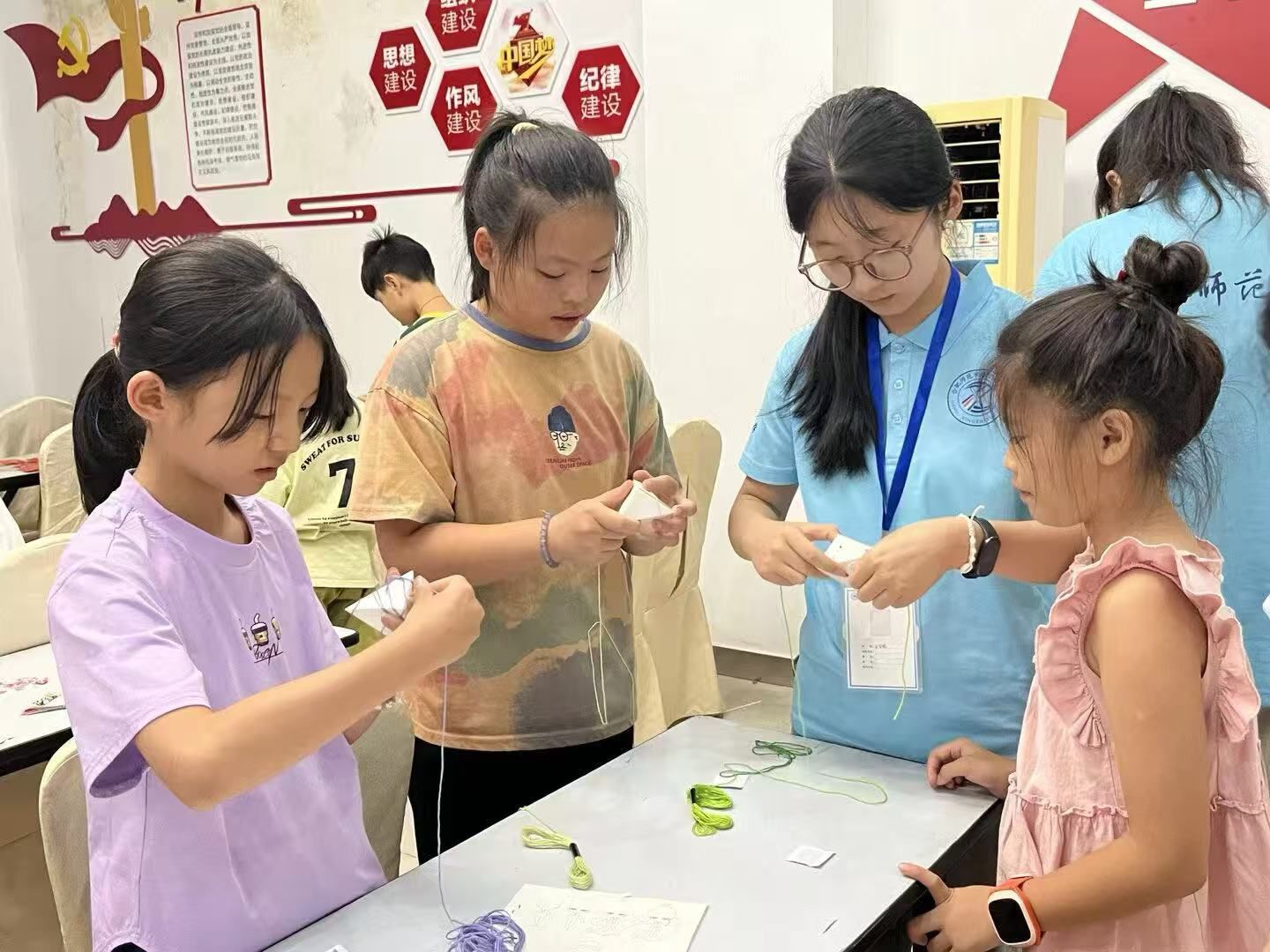 “小先生们”拿出硬纸片和彩线,边示范边讲解:“先这样折出粽子形状,用棉线绑好,系个蝴蝶结,纸粽子就成啦!”孩子们听得认真,迫不及待动手。制作中,“小先生”们穿梭在教室,时刻关注,“你的彩线可以绕紧点”“折痕再明显些更像粽子”,给予细致指导。一番努力后,一个个色彩斑斓的纸粽子摆满桌面,红的、绿的、黄的,仿佛真能闻到粽香,孩子们看着自己作品,成就感满满。