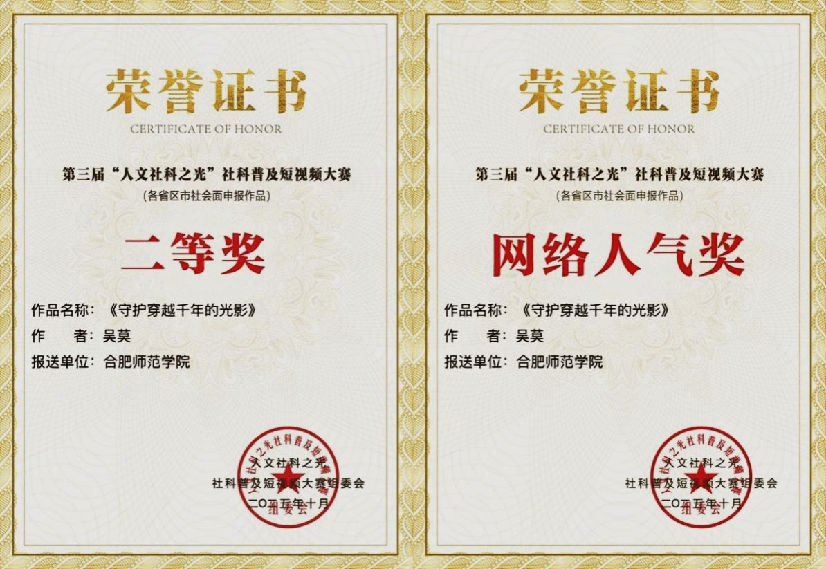 近日,全国第三届“人文社科之光”社科普及短视频大赛圆满落幕,365英国上市公司官网师生创作的《守护穿越千年的光影》(作者:吴莫,指导教师:曹晔华)获大赛二等奖,并获“网络人气奖”。
