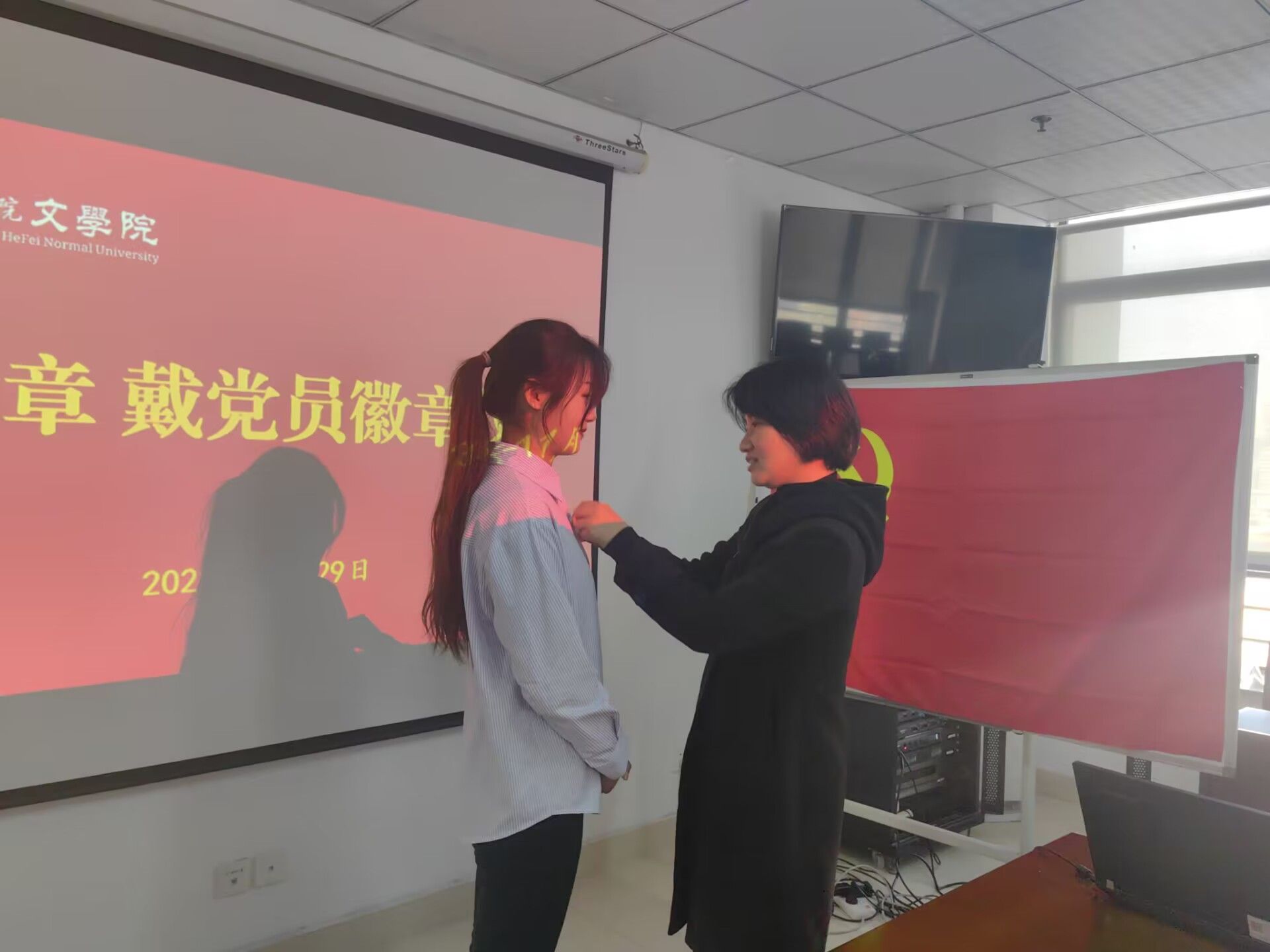 随后,夏娟、李娟、曹甜甜、王银银向新党员送党章,戴党员徽章。