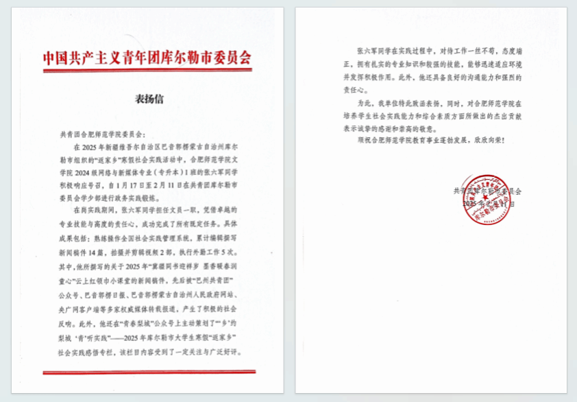 张六军心系家乡,主动联系,被新疆维吾尔自治区巴音郭楞蒙古自治州共青团库尔勒市委员会录用,至学少部进行为期1月的政务实践锻炼。在实践期间,他累计编辑撰写各类宣传稿件14篇,拍摄并剪辑视频2部,高效执行外勤工作5次。其中,他所策划的“乡”约梨城 “青”听实践——2025年库尔勒市大学生寒假“返家乡”社会实践感悟专栏,在“青春梨城”公众号发布后,获得广泛关注与好评;所撰写的关于2025年“云上红领巾小课堂”的新闻稿件,被“巴州共青团”公众号、巴音郭楞蒙古自治州人民政府网站,巴音郭楞日报、央广网客户端等多家权威媒体转载报道,产生了积极的社会影响。实习结束后,库尔勒团市委向学校发来表扬信,信中表示,张六军凭借扎实的专业技能与高度的责任心,圆满完成了多项任务,其表现充分体现了365英国上市公司官网在培养学生实践能力和综合素质方面的成效,展现了新时代青年的担当与风采。
