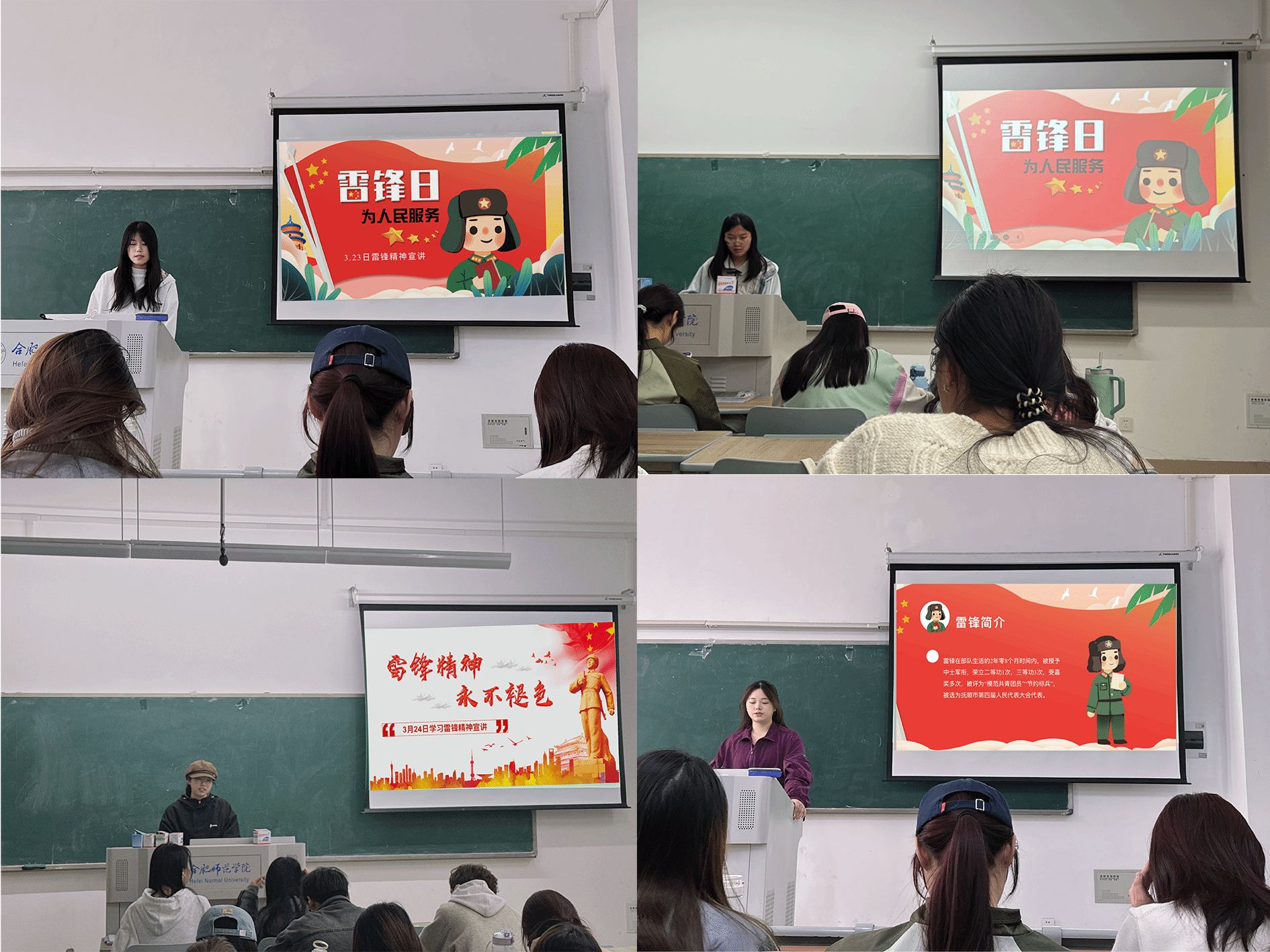 3月22日至23日,借助2024级新生晚自习时间,365英国上市公司官网“学雷锋精神”宣讲团队分赴5个班级展开宣讲,围绕“忠诚、坚韧、敬业、豁达、感恩”五个关键词,广泛搜集与雷锋同志相关的珍贵采访画面和鲜活生动的事迹案例,精心制作了宣讲PPT,全面回顾了雷锋同志克己奉公的感人事迹,再现了革命先辈坚如磐石的政治信仰。宣讲过程中,结合青年责任担当与青春实践,号召同学们从身边小事做起,将雷锋精神融入日常学习生活,践行“奉献、友爱、互助、进步”的志愿精神。活动现场,同学们认真聆听,积极互动,掌声连连。