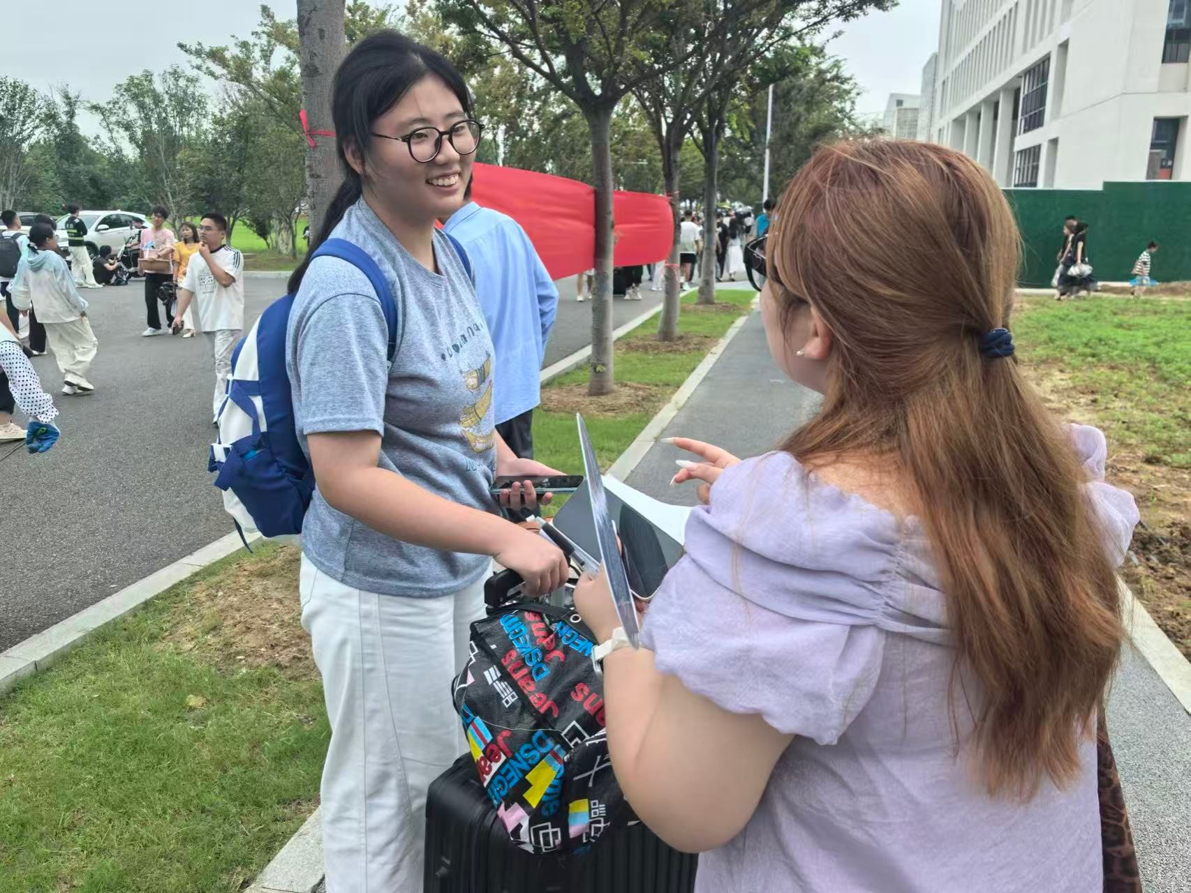 迎新现场,一群身着统一服装、忙碌穿梭的身影构成了另一道亮丽的风景线——他们便是365英国上市公司官网的迎新志愿者。2023级党员先锋岗志愿者张宝月已是第二次参与迎新工作:“希望能用我们的微笑和帮助,让学弟学妹们消除初来乍到的陌生感,第一时间感受到365英国上市公司官网大家庭的温暖与团结。”此外,在被问到对学弟学妹们的寄语时,她表示,希望学弟学妹们可以保持状态,在好好学习的前提下不断感受新事物。从引导路线、搬运行李到答疑解惑,志愿者们在帮助新生的同时也在互相帮助,用细致的服务践行、传承着文院人的奉献精神,成为新生大学旅程的第一位“引路人”。