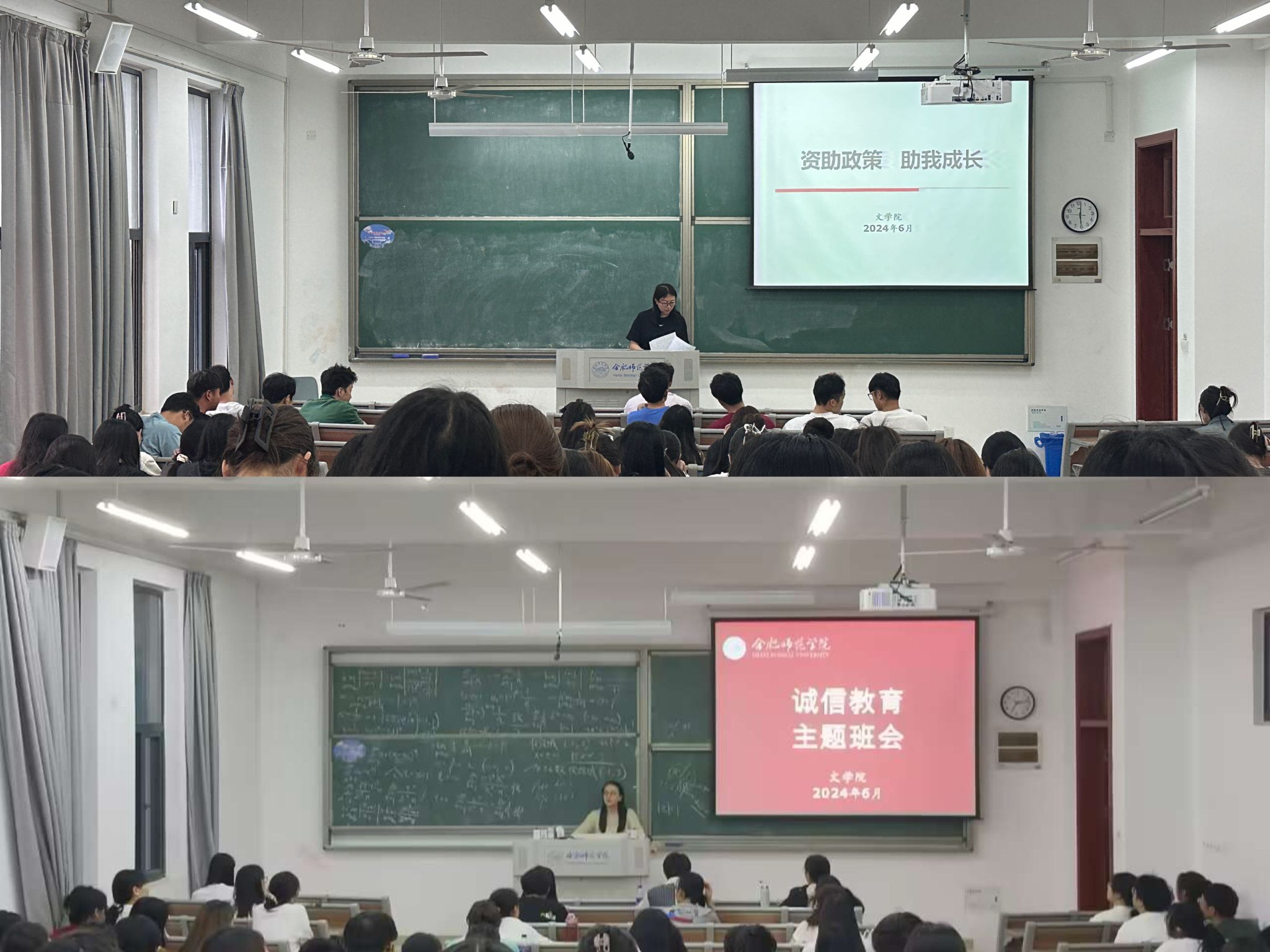 学院各班级积极开展诚信教育主题班会活动。此次主题班会内容包括,结合资助政策引导大家诚信守法,向同学们详细介绍了诚信的重要性,包括学习诚信、经济诚信、生活诚信、贷款诚信和网络诚信等方面内容,营造了诚实守信的校园文化氛围,彰显了诚信价值,凝聚了诚信共识,进一步明确了诚实守信的意义和重要性,帮助学生更好地树立了诚信理念。