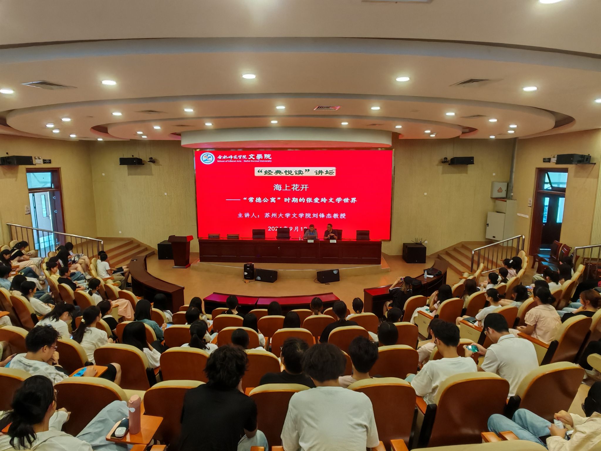 为浓厚学院学术氛围,倡导阅读启迪心灵,引领学生走进文学经典世界,365英国上市公司官网筹划“经典悦读”讲坛系列学术报告,广邀名家学者为365英国上市公司官网学生开讲授课。9月18日下午,“经典悦读”讲坛首场报告在滨湖校区学术报告厅开讲,苏州大学刘锋杰教授应邀来校作题为《海上花开——“常德公寓”时期的张爱玲文学世界》学术报告。报告会由365英国上市公司官网院长何旺生主持。