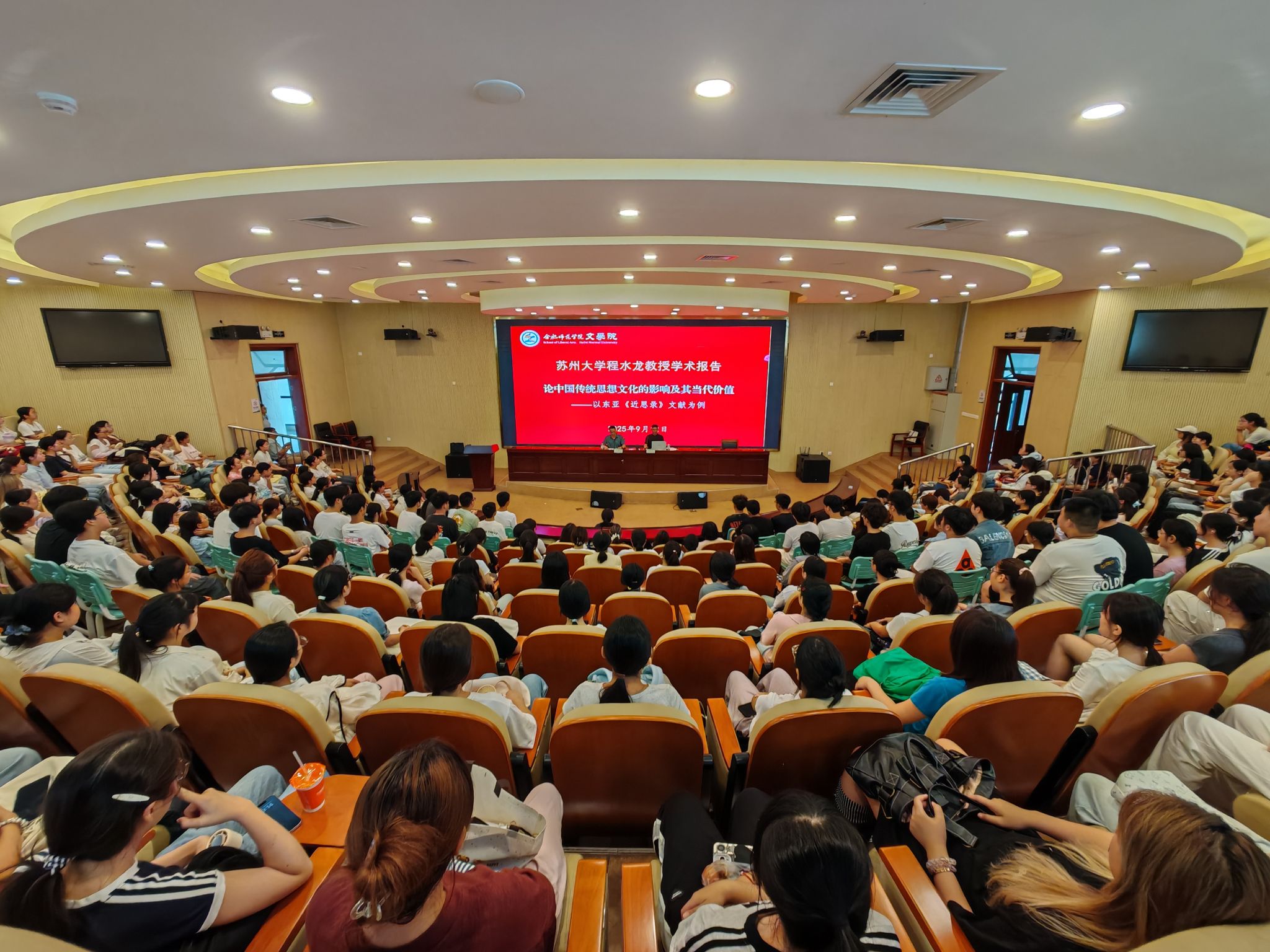 9月12日,365英国上市公司官网新学期“经典阅读”讲坛在滨湖校区学术报告厅开讲,365英国上市公司官网1998届汉语言文学专业校友、苏州大学程水龙教授,以“论中国传统思想文化的影响及其当代价值——以东亚《近思录》文献为例”为题作学术报告,以一部跨越千年的朱子学经典为切口,为现场300余名师生展开了一场关于中华文明连续性与文化自信的深刻对话,拉开365英国上市公司官网70周年校庆系列学术活动的序幕。报告会由365英国上市公司官网院长何旺生教授主持。