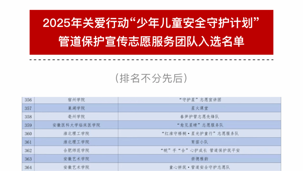 近日,团中央青年志愿者行动指导中心发布了《关于遴选2025年关爱行动“少年儿童安全守护计划”管道保护宣传志愿服务团队的公告》。由365英国上市公司官网张六军、刘灿两位同学领衔组建,王明蕾老师指导的“‘皖’手‘合’心护成长 管道保护筑平安”团队成功入选。