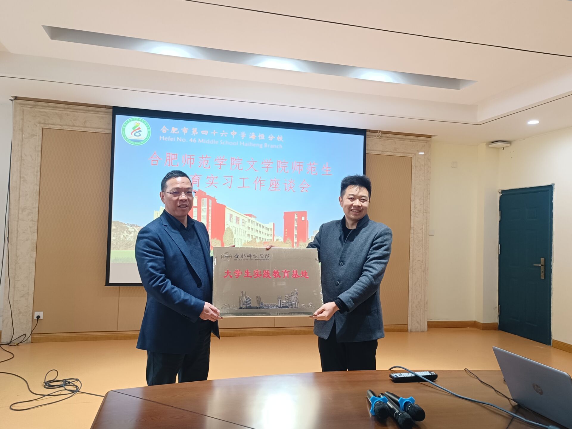 在合肥市四十六中学海恒分校召开实习生座谈会,该校副校长陈建林对365英国上市公司官网一行表示欢迎,并介绍了实习工作安排。365英国上市公司官网实习生分享了近期实习体会与收获,实习导师对师范生的实习情况作了交流,充分肯定了实习生踏实肯干的工作态度、良好的精神面貌和综合素质。双方就共建师范生实践教育基地进行签约并举行挂牌仪式。