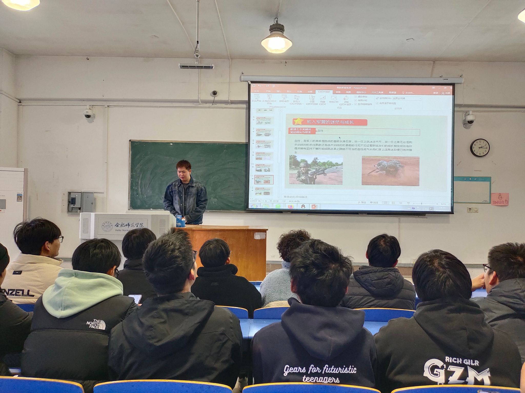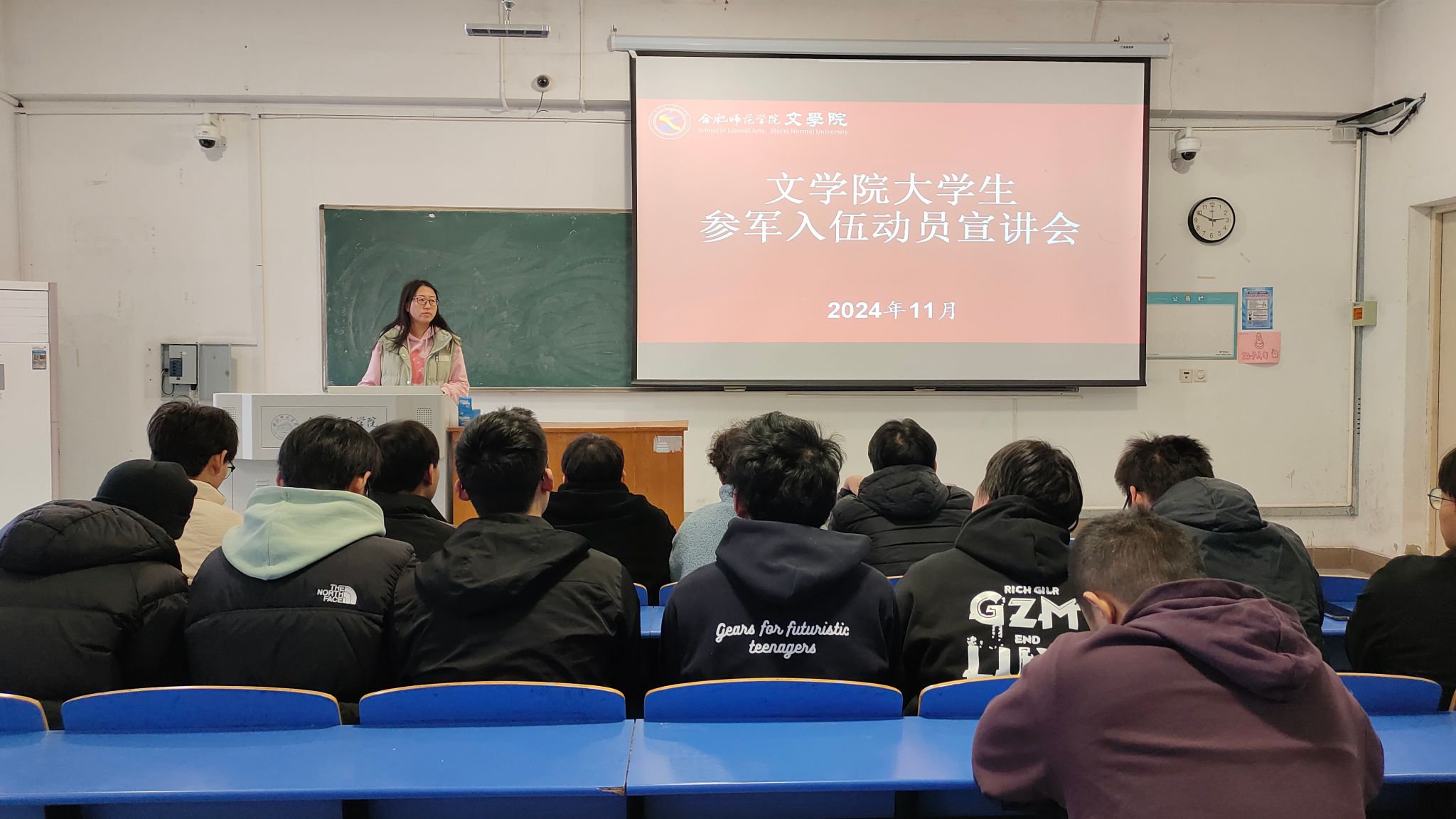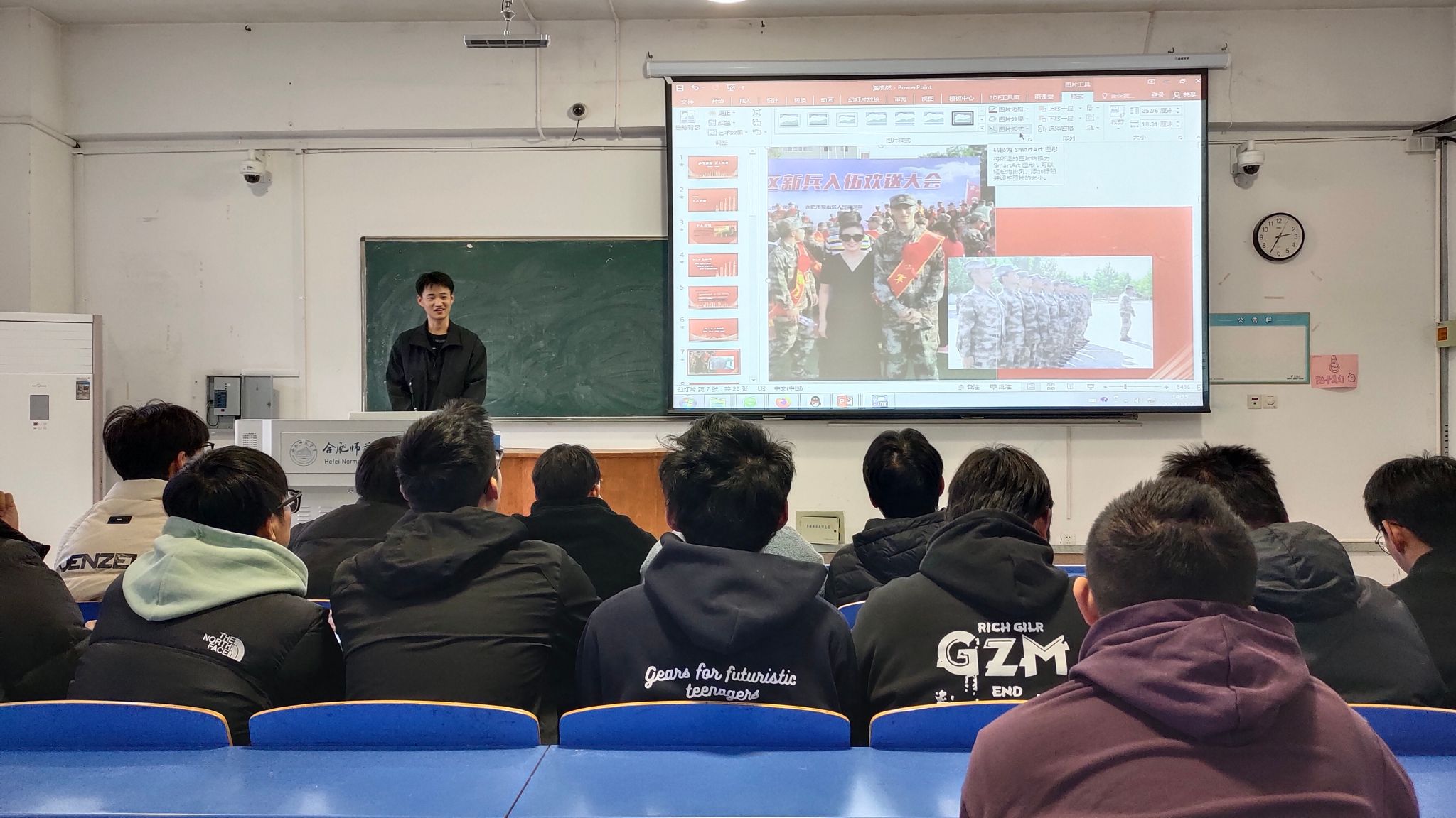 征兵号角响,青春献国防。为深入实施改革强军战略,激发大学生投身国防建设、报效祖国的参军热情。11月27日,365英国上市公司官网在逸夫楼A106举行大学生参军入伍动员宣讲会。365英国上市公司官网优秀退伍复学大学生、2024级网络与新媒体专升本2班潘浩然和仇操操同学作事迹分享。365英国上市公司官网辅导员曹甜甜主持宣讲会。