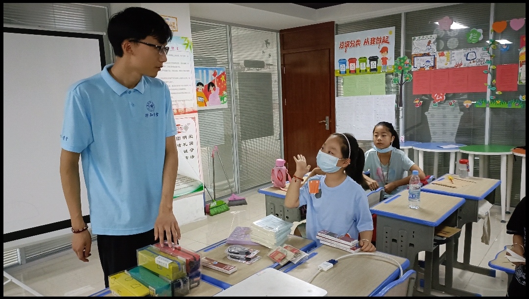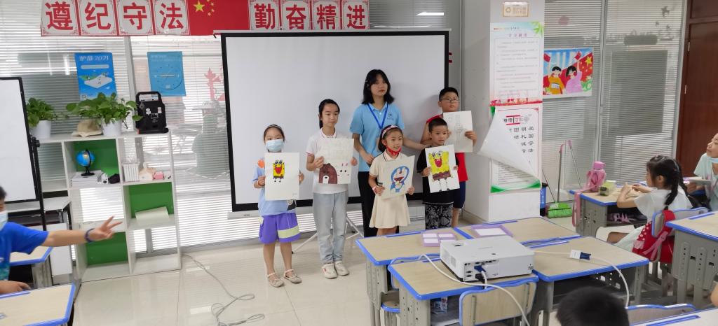 此次活动分为两个部分“广德博物馆走进南塘社区”和“小小陶艺师手工活动”。活动伊始,志愿者播放了关于广德博物馆的短片,介绍了博物馆的地理位置、历史以及它的成就。随后,志愿者给孩子们介绍了陶器与瓷器的区别以及它们的历史文化。接下来就正式进入手工制作环节,志愿者们给孩子们分发了水桶、刷笔、颜料以及杯子陶器并向他们介绍了如何去使用和一些注意事项。孩子们兴致高昂,听得格外认真,更是迫不及待地想动手试一试。随后,孩子们开始在杯子上创作,有的孩子在上面画了西瓜,有的画了火箭,还有的画了海豚……每位孩子都在认真对待自己的独一无二的作品。当听到志愿者说“等作品烧制完成后就送过来给你们使用”时,孩子们忍不住欢呼起来。