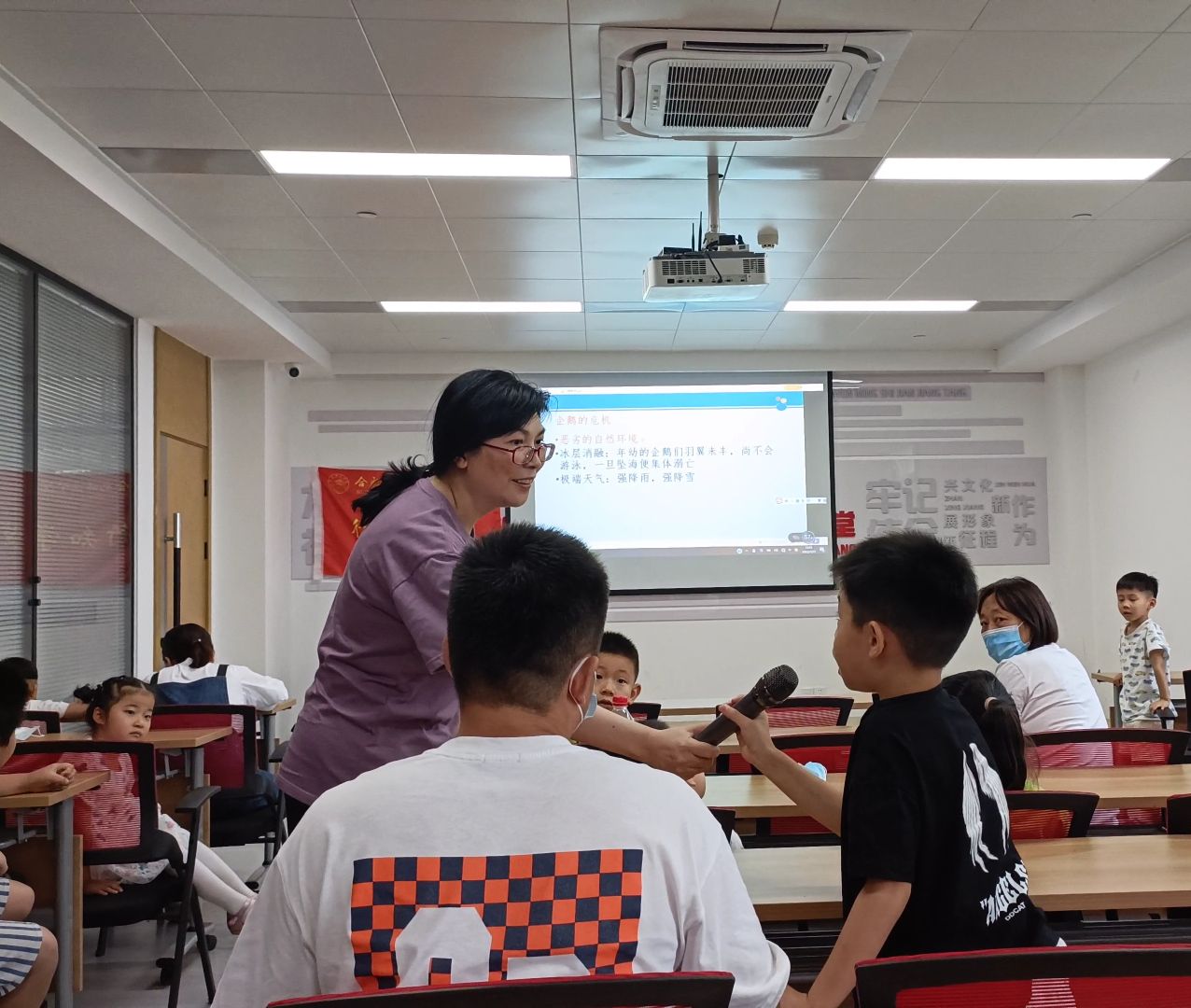 当郭教授讲解完有关企鹅家族的知识后,她提出让有疑问的小朋友举手提问,孩子们都充满好奇心的提出了许多有意思的问题如“为什么企鹅喜欢吃乌贼?”“为什么有的企鹅分布在赤道周围?”“企鹅的天敌是谁?”,郭教授耐心地向小朋友们讲解,给他们充分表达自己观点的机会,课堂的氛围也变得更加轻松活跃。