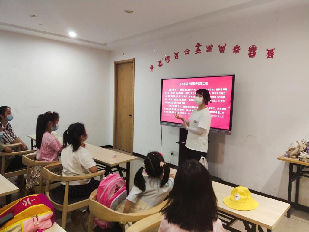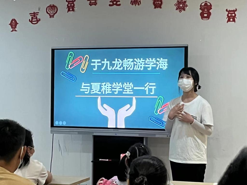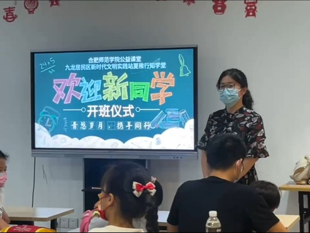 此次开班仪式是由夏稚行知学堂的领队小先生——陈睿主持的。首先,她向全体同学和家长介绍了我院行知学堂的办学理念、办学背景以及学堂的概貌。行知学堂自开办以来,一直深受广大学生的喜爱,在安徽多地以公益课堂为形式开展,引导青年学生实践出真知、实践长真才,也曾多次被《中国青年报》《人民日报》等报刊或网页刊登宣传。本次夏稚行知学堂以“思想教育”“兴趣培养”“科学普及”“情感教育”“心理辅导”“劳动教育”“公益实践”“安全防护”“课业辅导”为主要内容,开展了十五项课程,并安排专门的小先生进行教学教导。