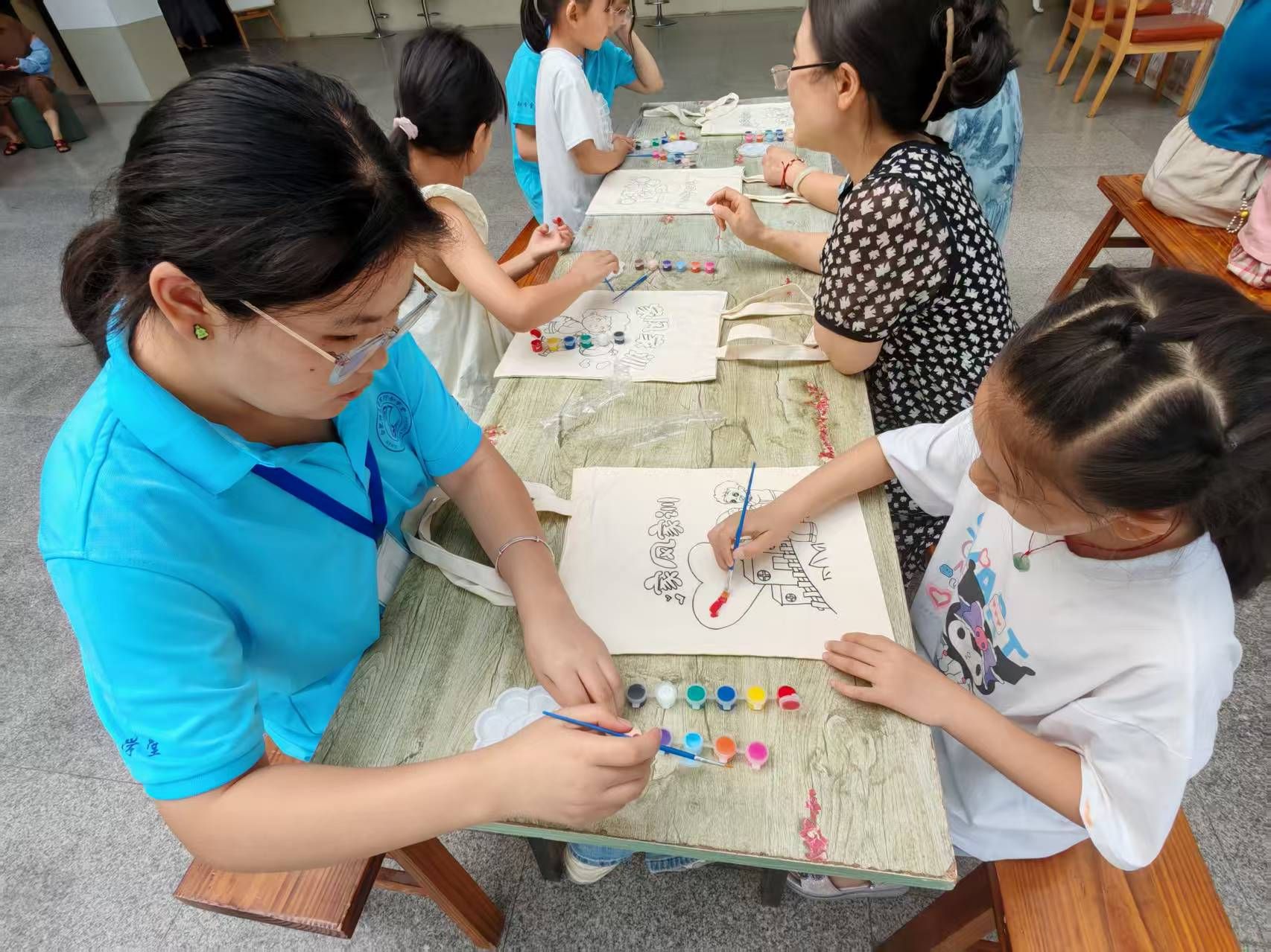 理论讲解后,便进入了手工创作环节——家风家训帆布包绘制。孩子们兴奋地挑选颜料,家长们在一旁耐心陪伴、出谋划策。有的家庭以“孝”为主题,用画笔勾勒出孩子给长辈捶背的温馨场景;有的聚焦“俭”,描绘出珍惜粮食、节约用水的画面;还有的将“和”融入创作,展现家人围坐、其乐融融的模样。在小先生们的协助下,一个个空白的帆布包渐渐变得色彩斑斓,每一笔色彩、每一幅图案,都饱含着对家风家训的理解与传承。